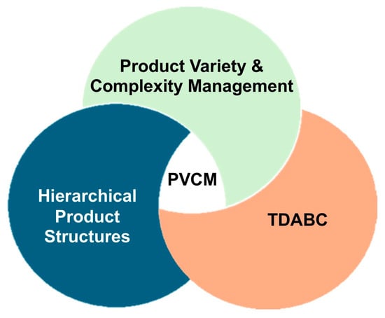 Conceptual overview of the PVCM. A three-domain Venn diagram illustrating how Time-Driven Activity-Based Costing (TDABC), hierarchical product structures, and product variety and complexity management intersect to form the PVCM framework.