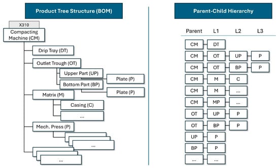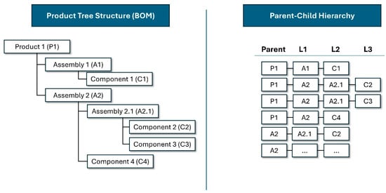 Product structures are represented as parent–child hierarchies derived from BOM relationships, enabling identification of abstraction levels (component, subsystem, product) as suggested in Nørgaard et al. [24] for improved accuracy of cost allocations. This stage provides the basis for detecting unique parts and understanding how variety propagates through the product portfolio. The product structure is the physical and hierarchical representation of all parts and assemblies that make up the product, essentially, the product BOM [53]. The part relationships, which correspond to the BOM for each product, are represented as extended strings that display the complete chain of links between part numbers across the entire product portfolio in the parent–child hierarchy, revealing the full extent of relations between part numbers without duplicates. This structure enables the identification of the abstraction level of each part number, whether at the product, subsystem (assembly), or component level. A generic example of the transformation is provided in Figure 3.