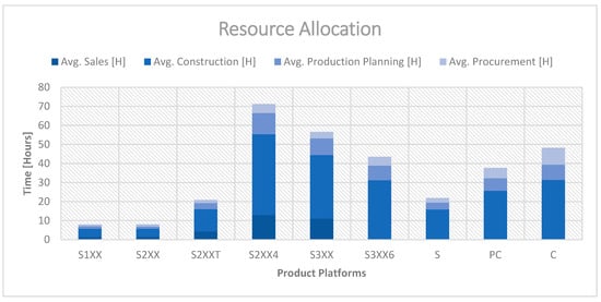 Product life cycle activities are mapped across departments, forming the basis for developing a resource allocation index. Estimates are derived from domain experts with daily operational experience, and, following the principles of TDABC, time-based resource measures are assigned to each activity. By linking the identification of unique parts with the estimated effort required for their creation, the model allocates resources across abstraction levels in proportion to the degree of variety introduced into the portfolio. A mathematical formula is used in the allocation model for allocating resources to each department. The formula is listed in Equation (2).