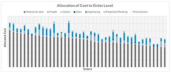 In Figure 10, an excerpt of invoiced orders illustrates the layering of costs that can be allocated to the different orders. By integrating these cost components, it becomes possible to calculate the contribution margin ratio with variance cost included that reflects the impact of product variety. This step enables a more comprehensive evaluation of the financial consequences of variance by linking direct costs with the resource allocations established in earlier phases. To avoid uncertainty in cost-driver estimation, the PVCM triangulates expert-based time and resource inputs with multiple internal data sources, including departmental capacity, historical cost records, and order-level profitability data. Although cost drivers are inherently company-specific and may involve subjective judgment, aligning them with the company’s actual cost structure and revenue patterns reduces bias and strengthens the reliability of the resulting cost allocations. By integrating multiple cost layers, this stage establishes the link between resource allocation and financial performance, thereby providing the basis for evaluating the CMRV.