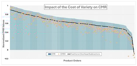 Finally, the CMRV can be compared against both the regular contribution margin ratio (CMR) [55,56] as a benchmark value and the traditional overhead-based allocation methods, where the overhead costs are typically spread evenly across all products [3,56]. This comparison highlights deviations attributable to variety, providing insights into the true financial consequences of product customization and complexity.