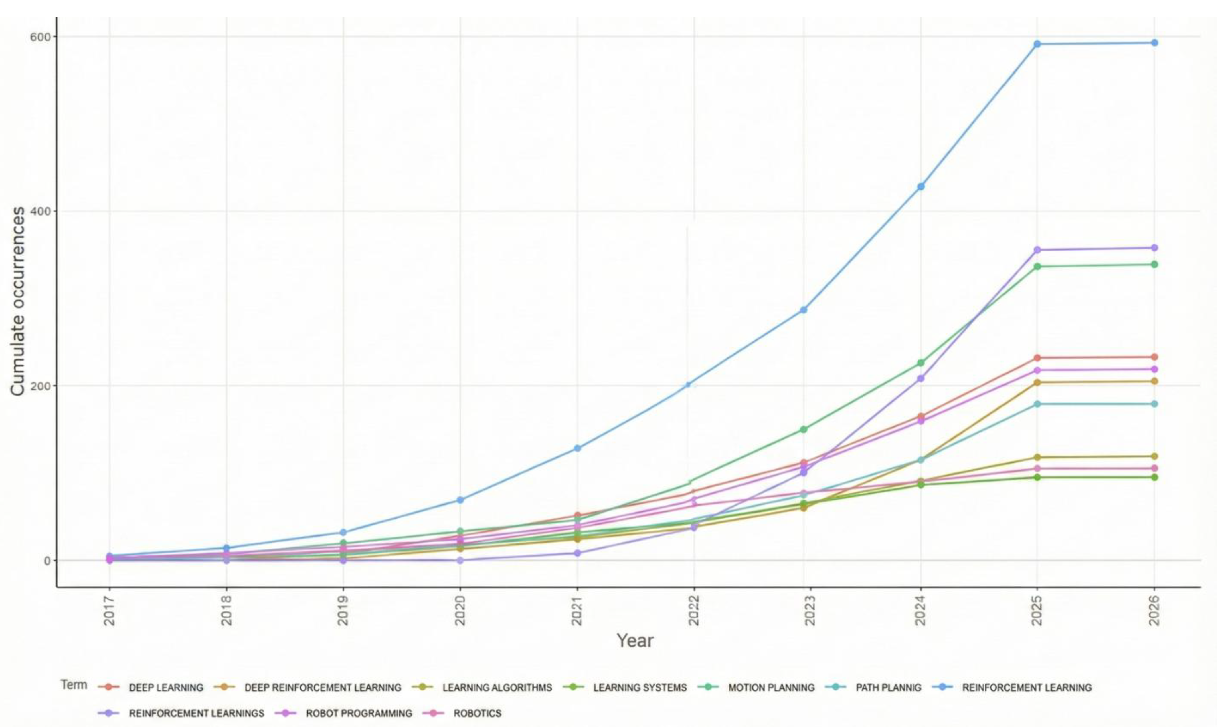 - Inclusion criteria: (i) peer-reviewed journal articles and reviews; (ii) published between 2017 and 2026; (iii) explicitly addressing RL/DRL in robotics, autonomous systems, or manufacturing automation; (iv) containing at least one of the target keywords in title, abstract, or keywords;