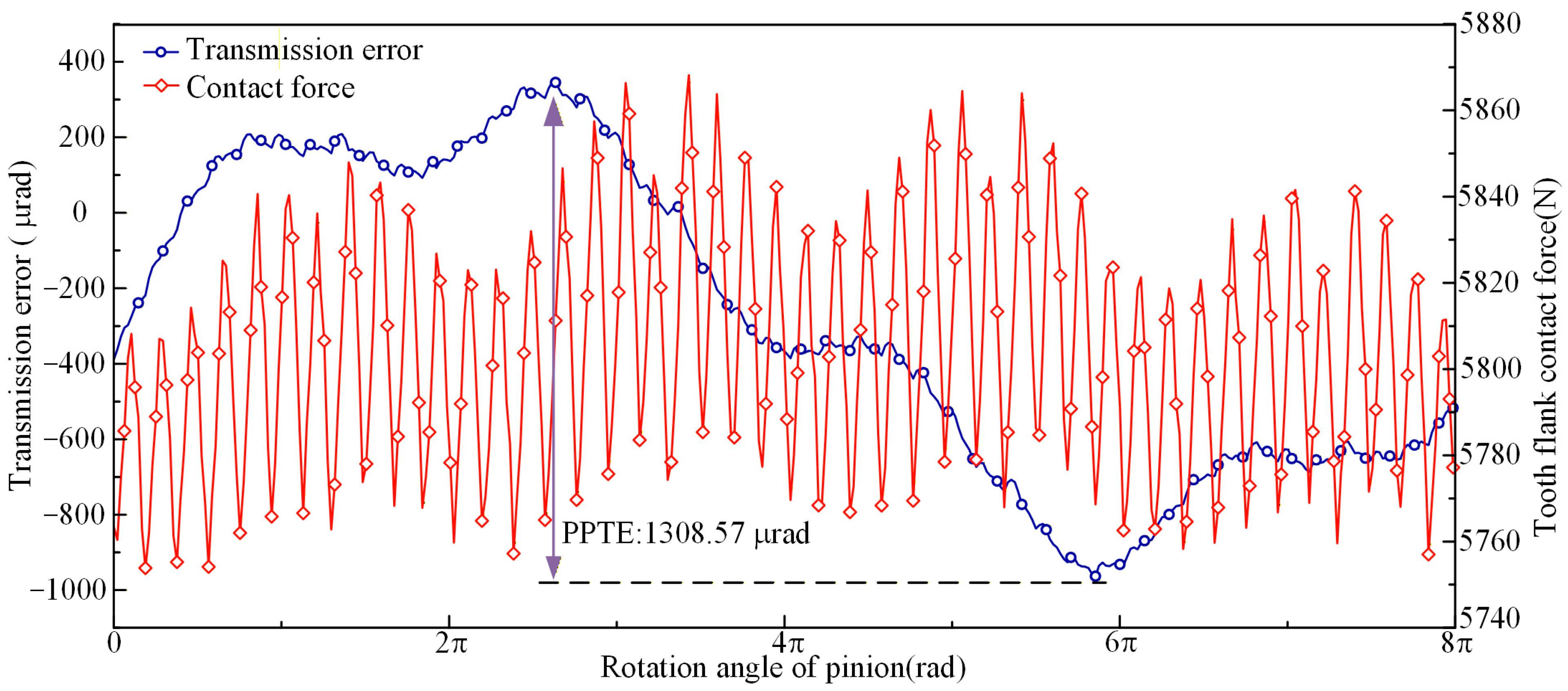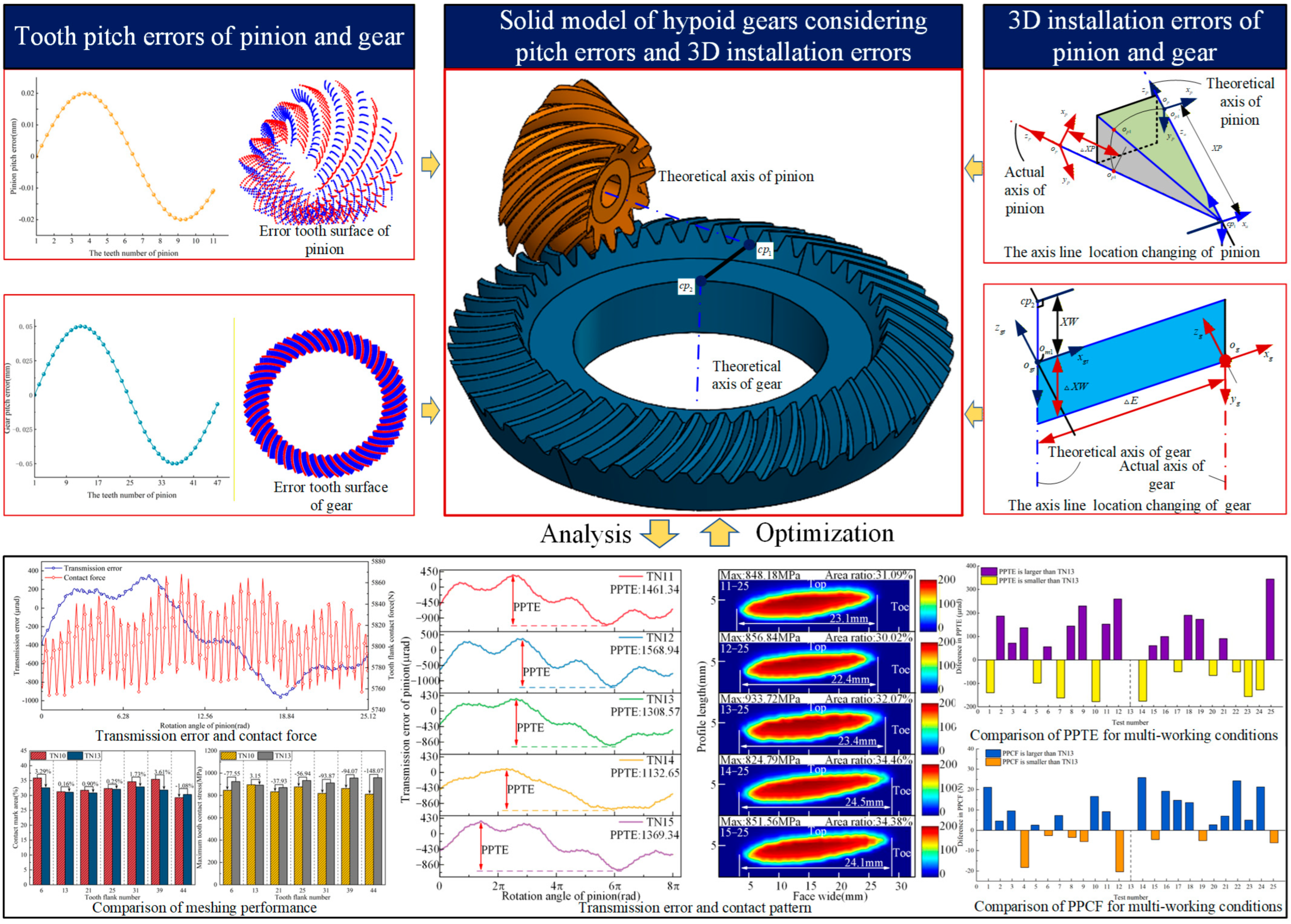 - The influence of installation errors on meshing performance exhibits dual effects. Installation errors can compensate for midpoint tooth pitch errors, effectively reducing PPTE and thereby enhancing meshing performance. Installation errors may also increase PPTE, while reducing the maximum contact stress and increasing the contact pattern area ratio.
