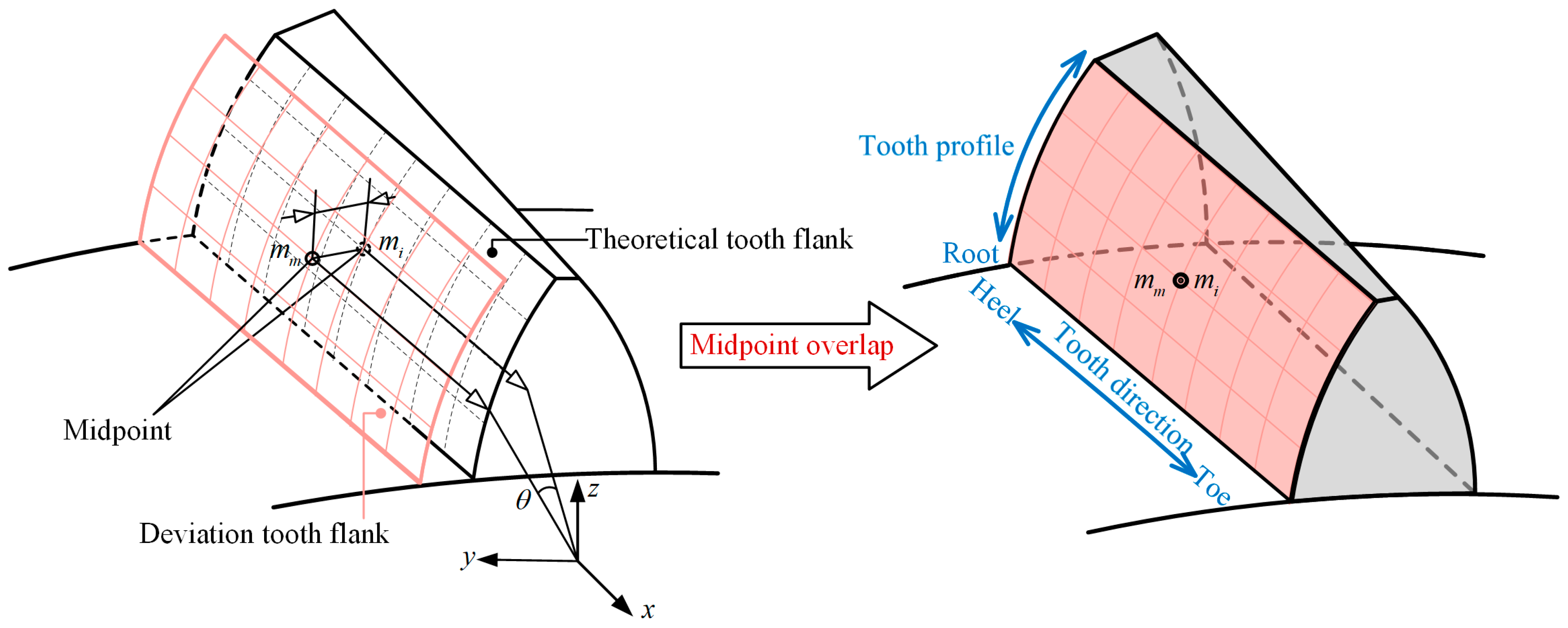 - He, D.; Ding, H.; Tang, J. A new analytical identification approach to the tooth contact points considering misalignments for spiral bevel or hypoid gears. Mech. Mach. Theory 2018, 121, 785–803. [Google Scholar] [CrossRef]