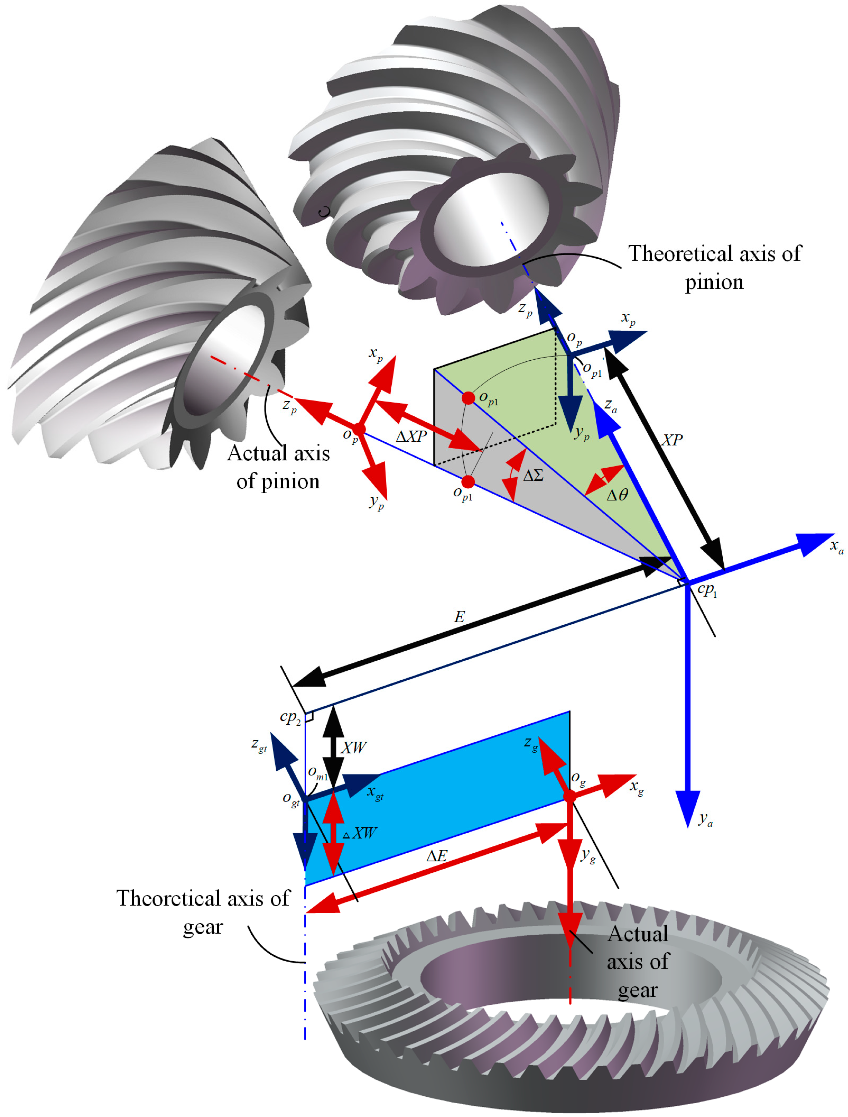- By introducing , the construction of a 3D installation error model is enabled for the quantitative characterization of installation parameters. A coupling characteristics analysis between installation errors and tooth pitch deviations is conducted.