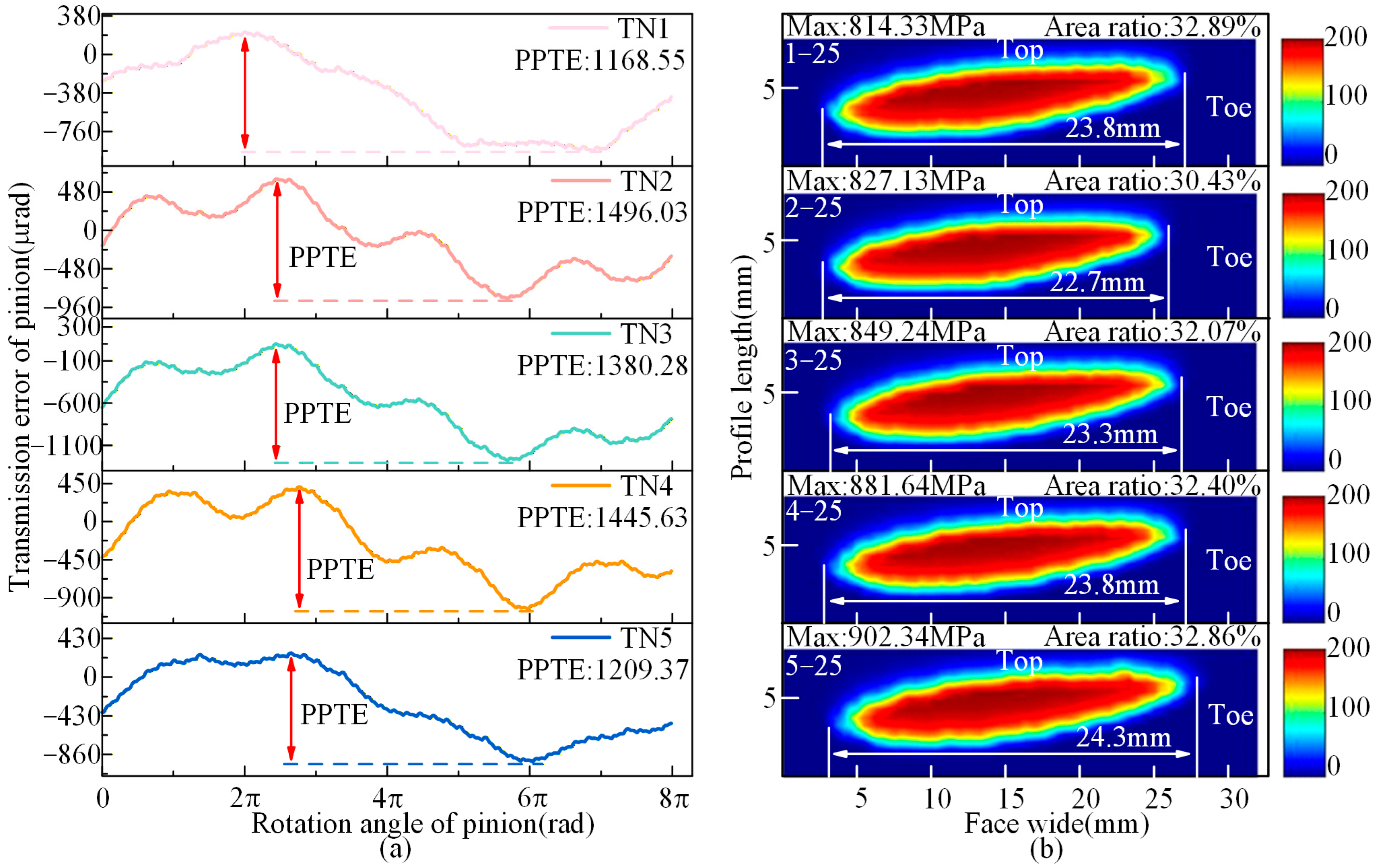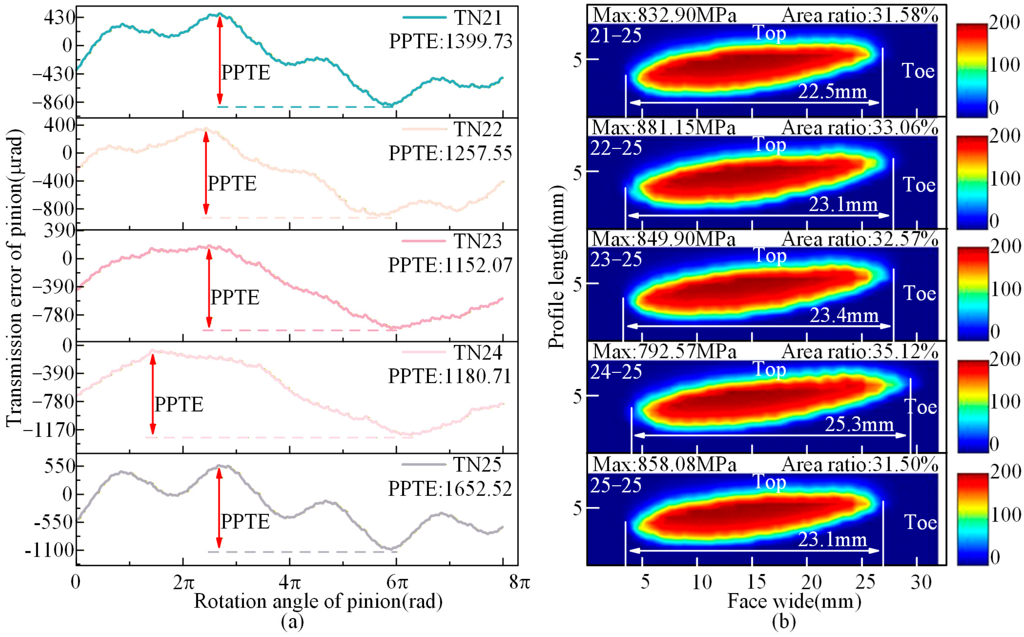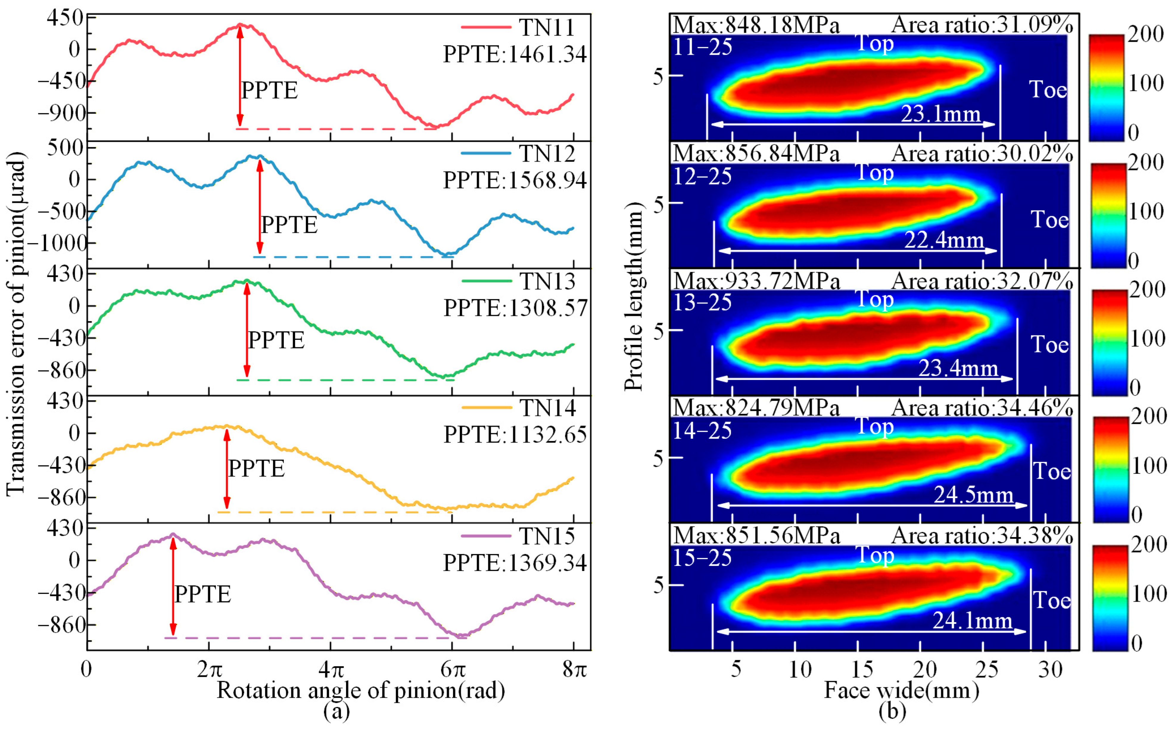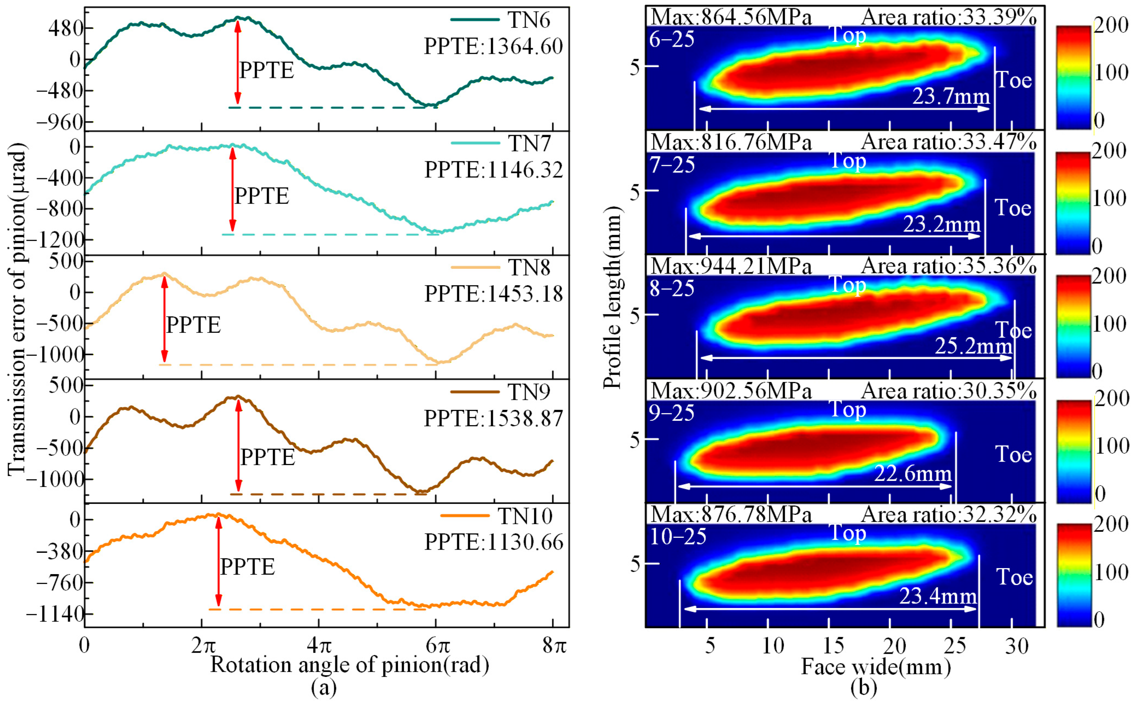 - Under TN10, the PPTE is reduced by 3.78% compared to TN13, thereby collectively enhancing meshing performance. Under TN25, the PPTE increases by 26.28% compared to TN13. However, the contact pattern average length improves by 2.29%, and the maximum contact stress is significantly reduced.