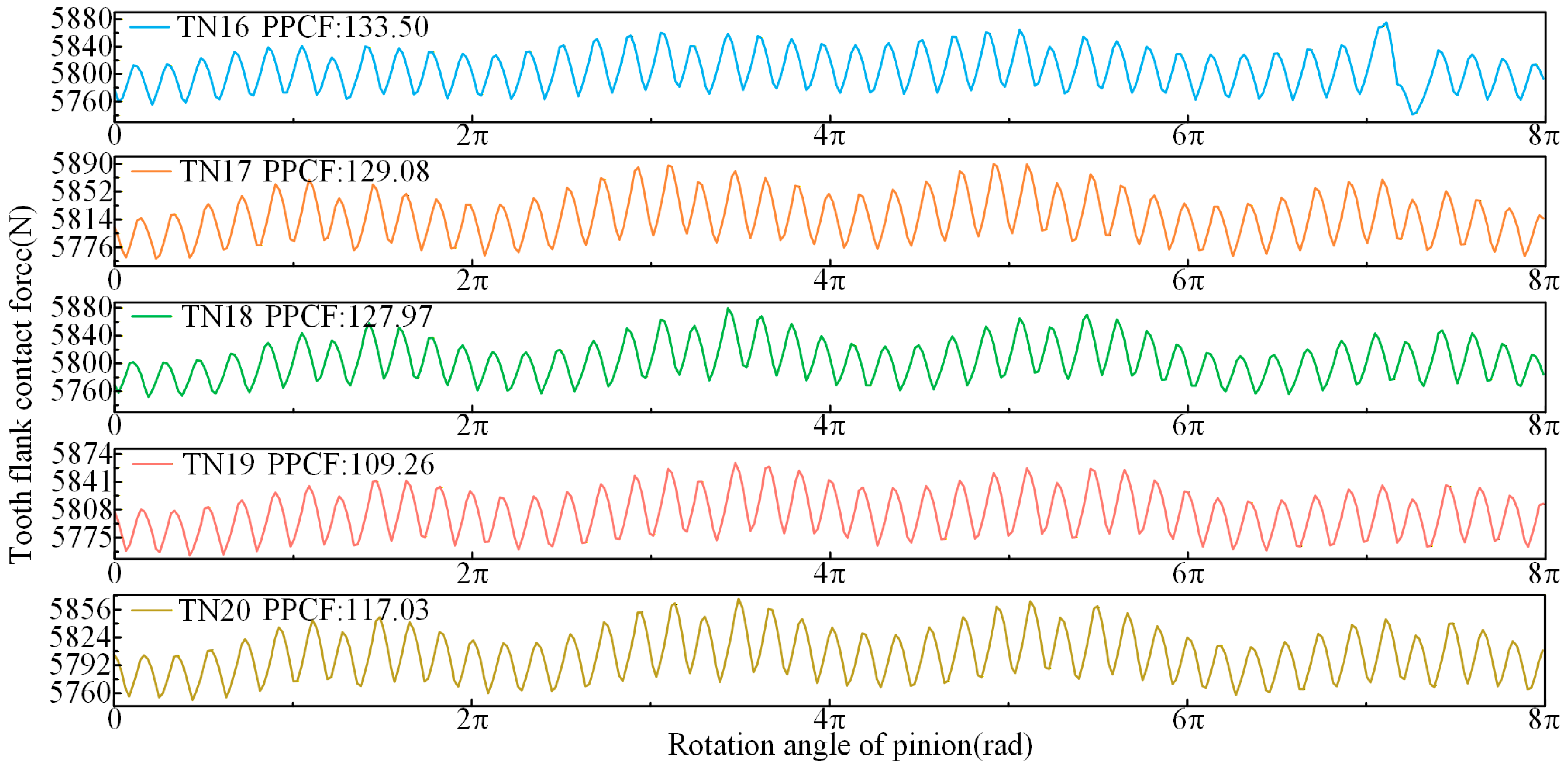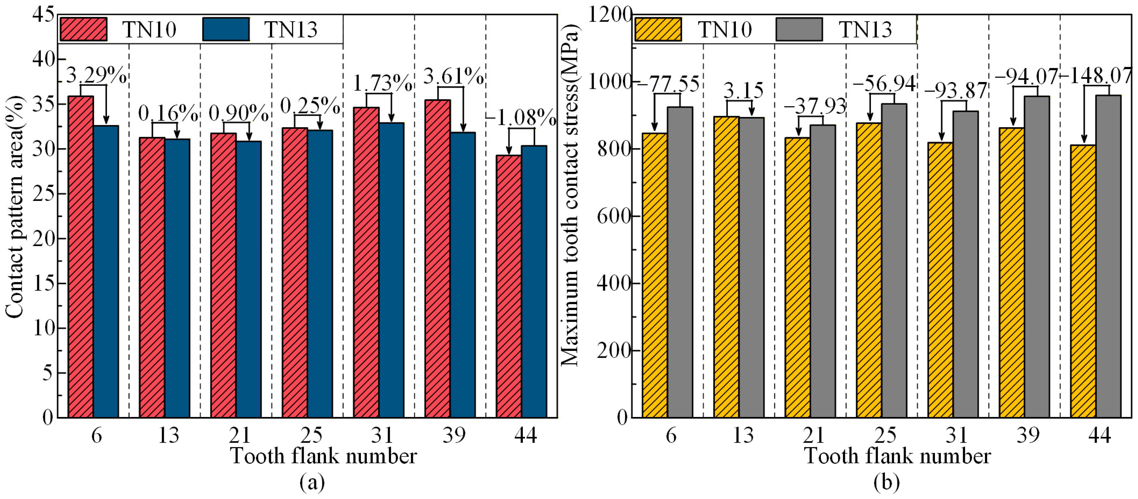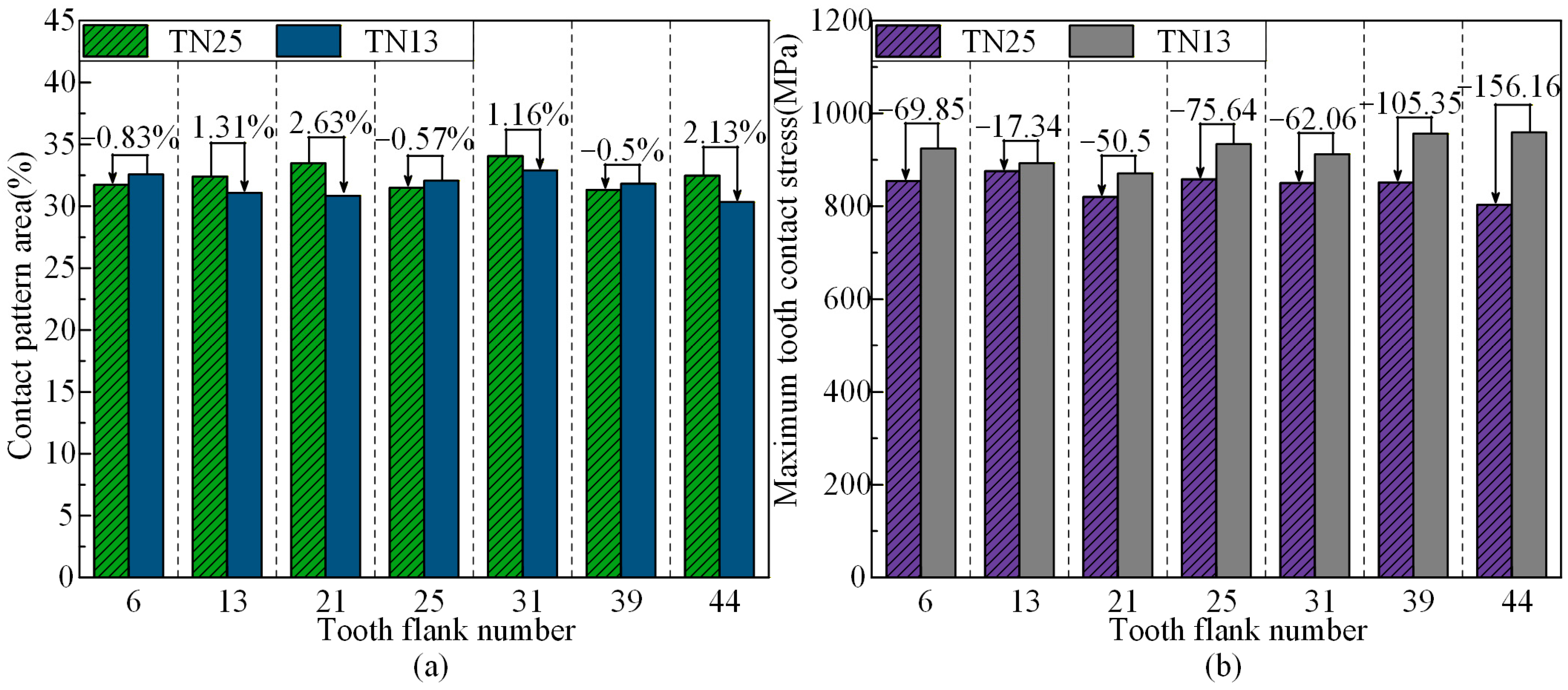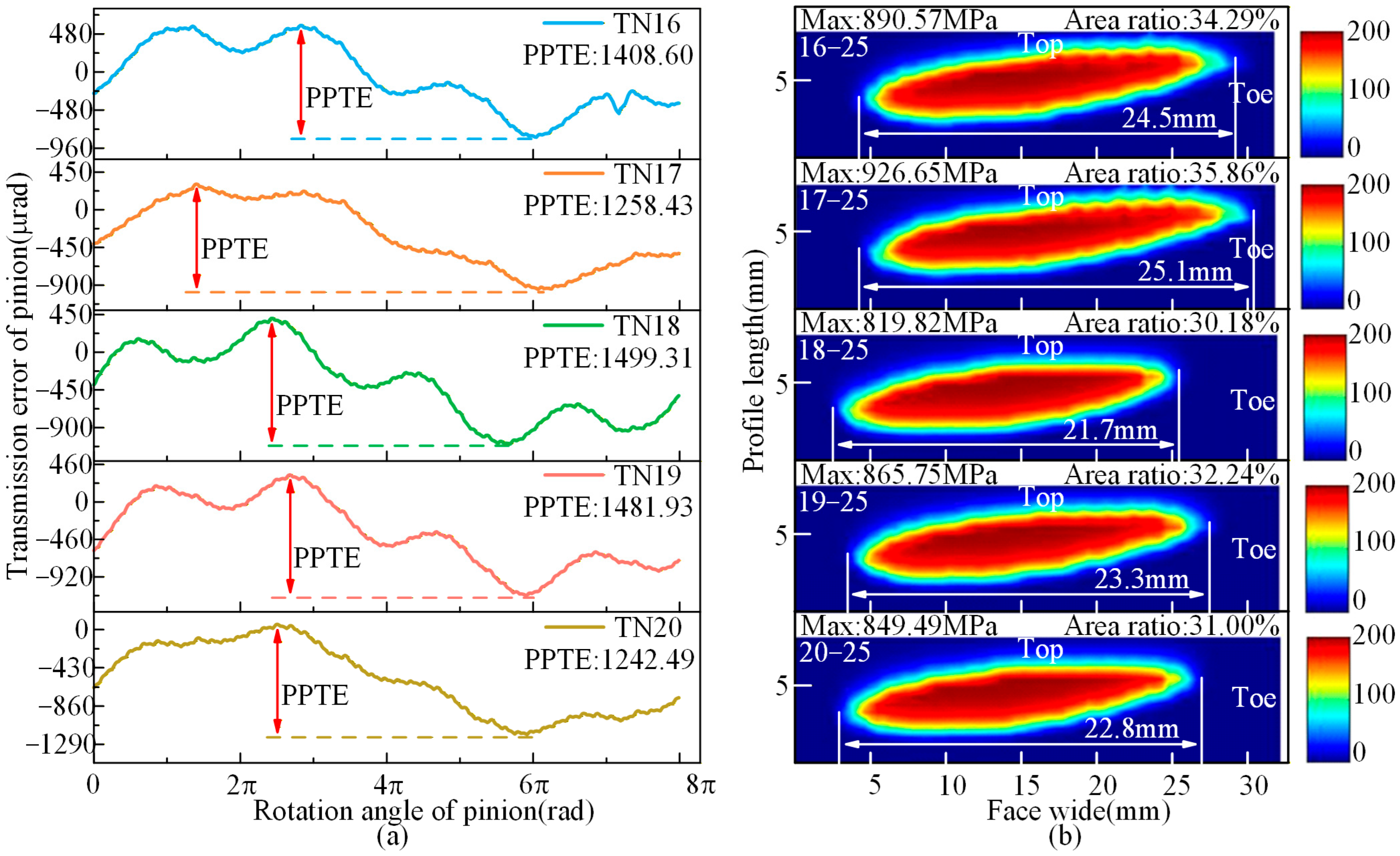 - Under TN10, the PPTE is reduced by 3.78% compared to TN13, thereby collectively enhancing meshing performance. Under TN25, the PPTE increases by 26.28% compared to TN13. However, the contact pattern average length improves by 2.29%, and the maximum contact stress is significantly reduced.