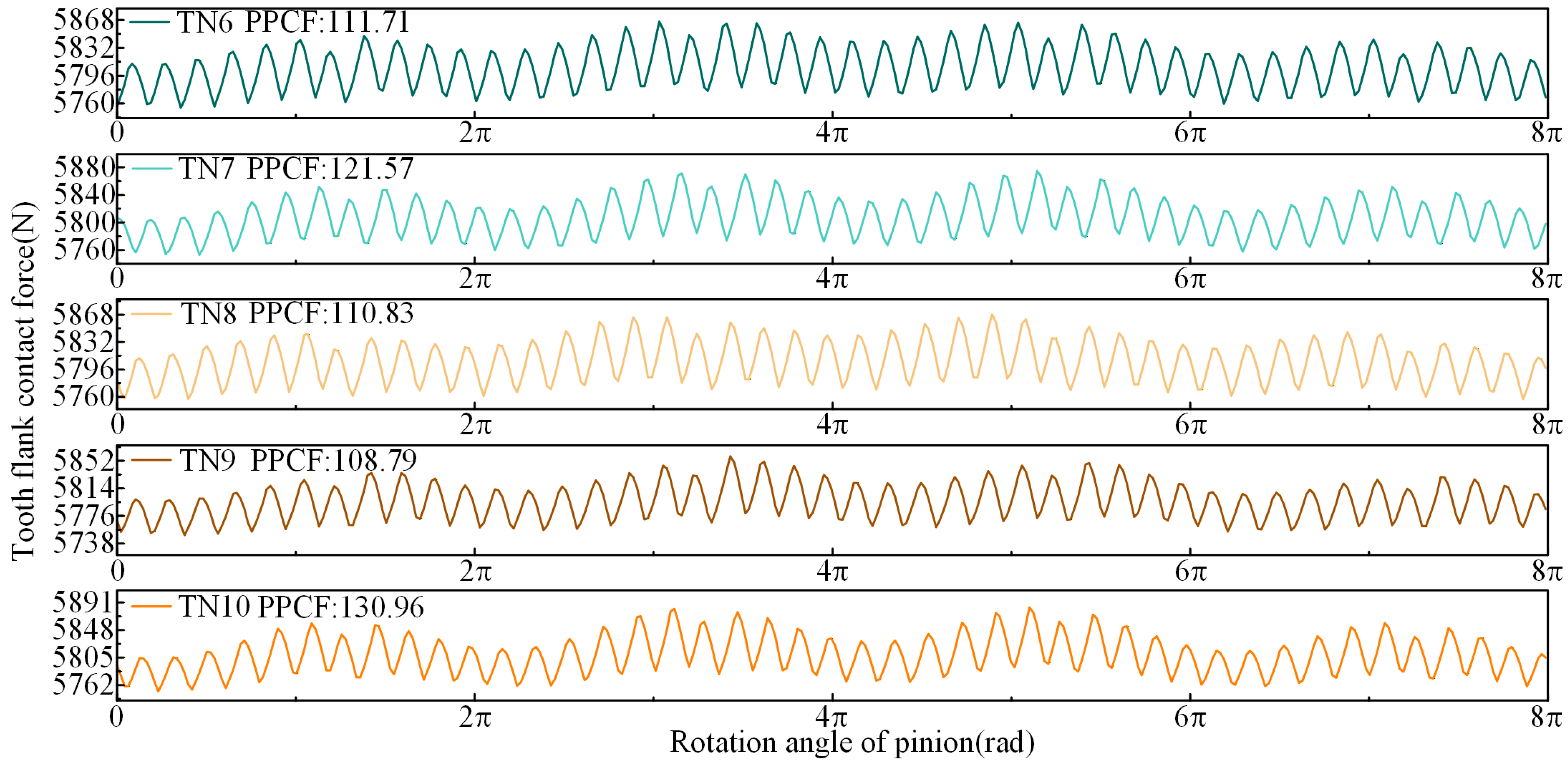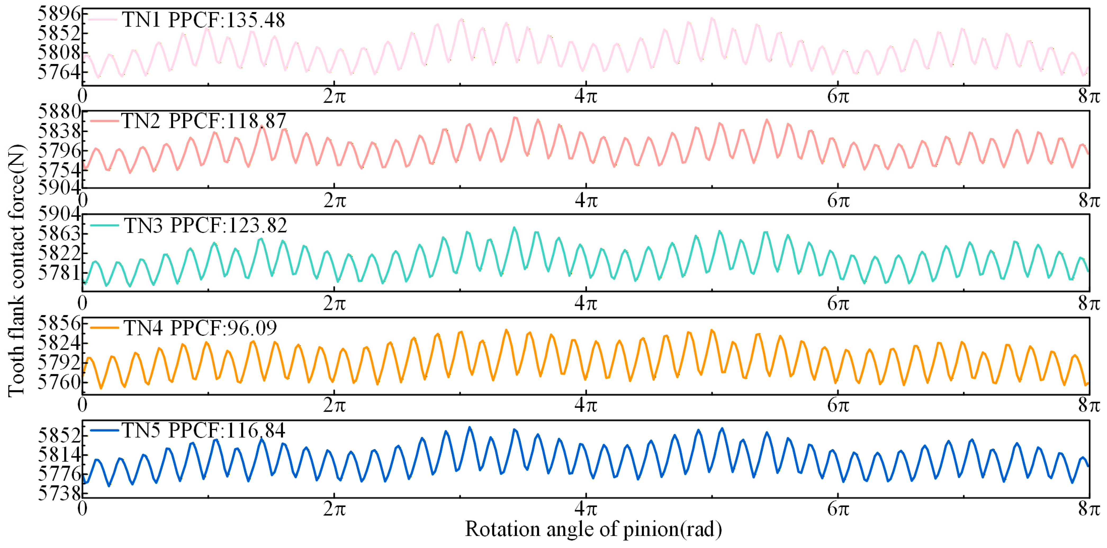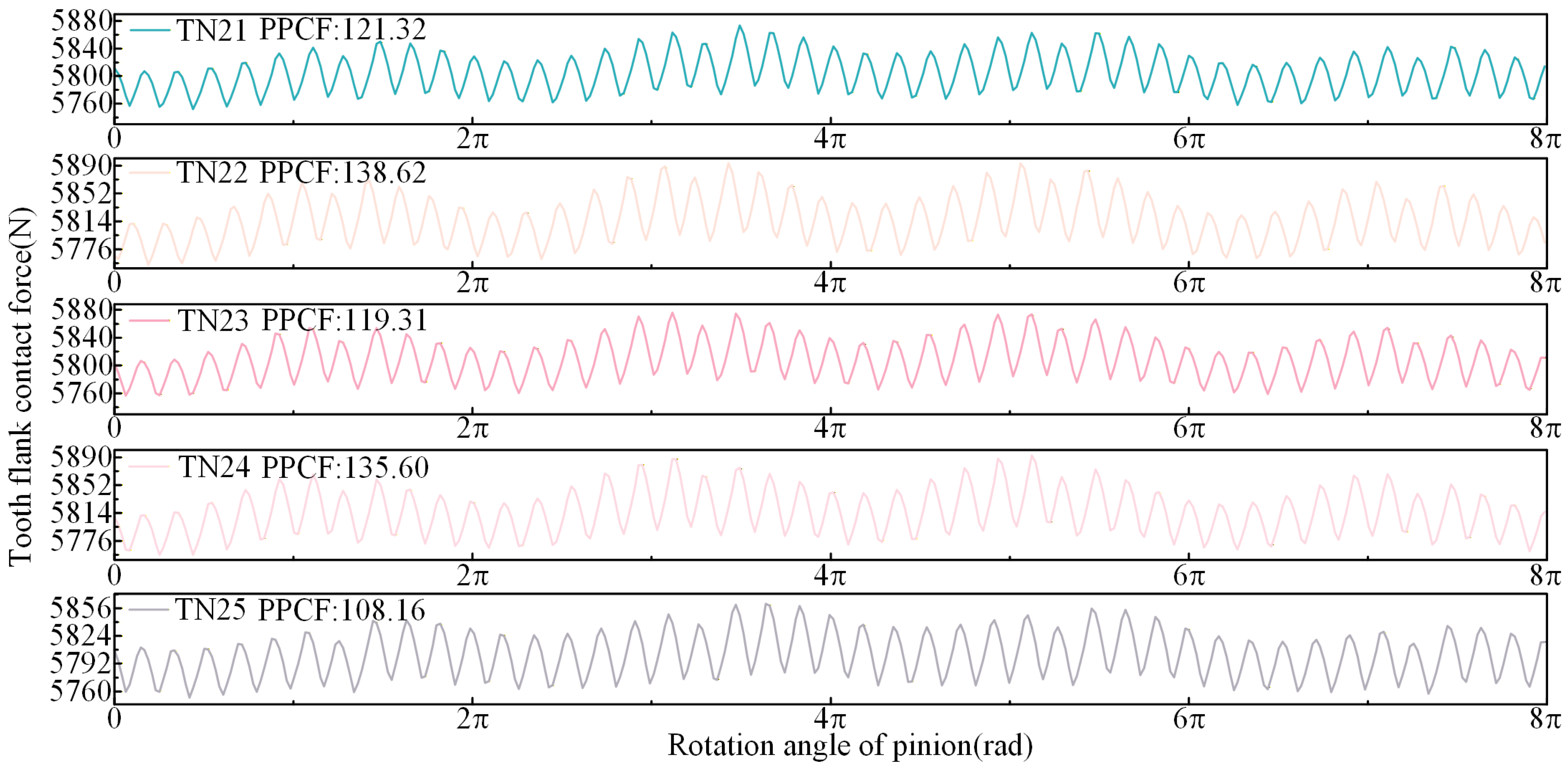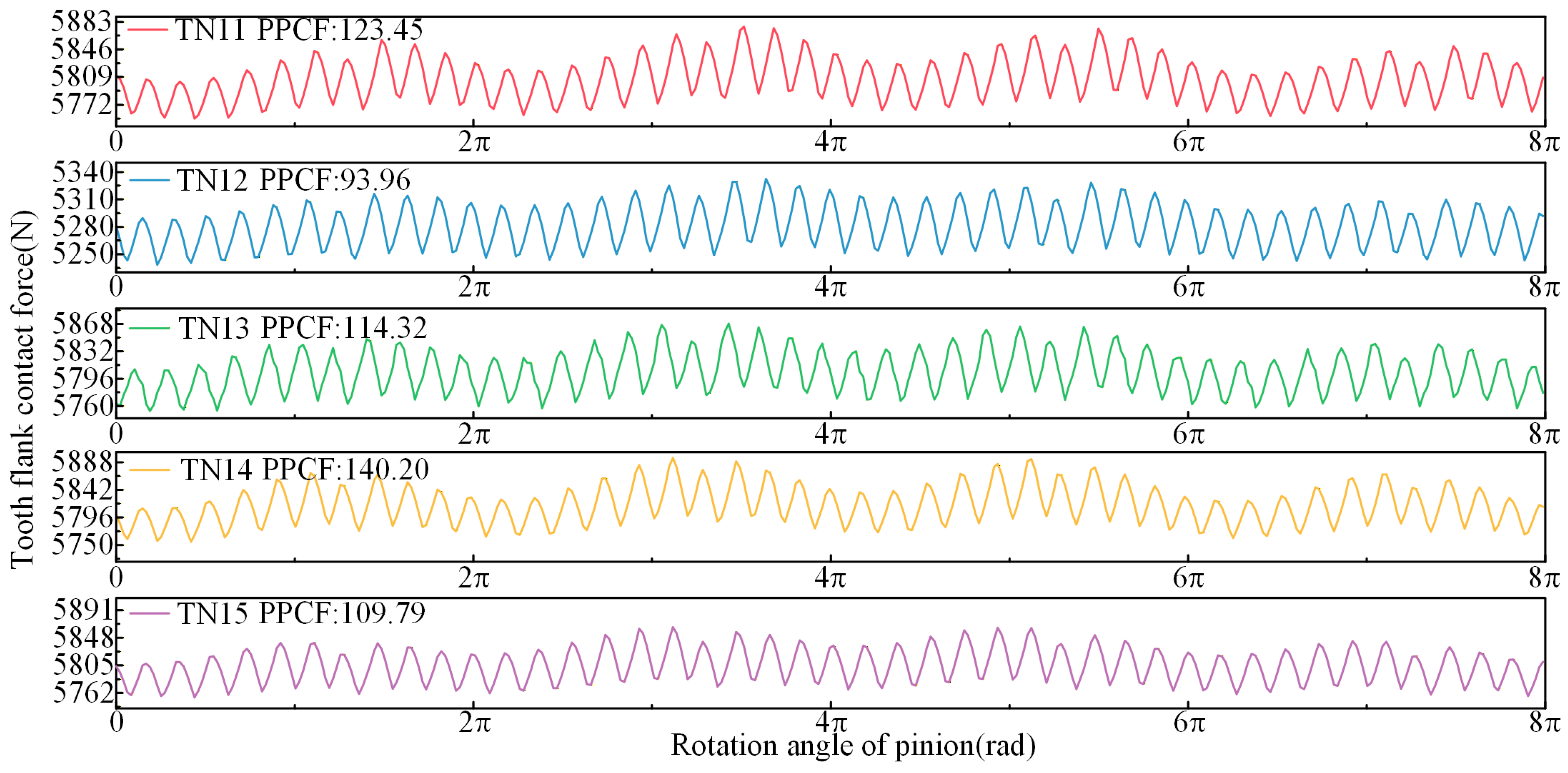 - Under TN10, the PPTE is reduced by 3.78% compared to TN13, thereby collectively enhancing meshing performance. Under TN25, the PPTE increases by 26.28% compared to TN13. However, the contact pattern average length improves by 2.29%, and the maximum contact stress is significantly reduced.