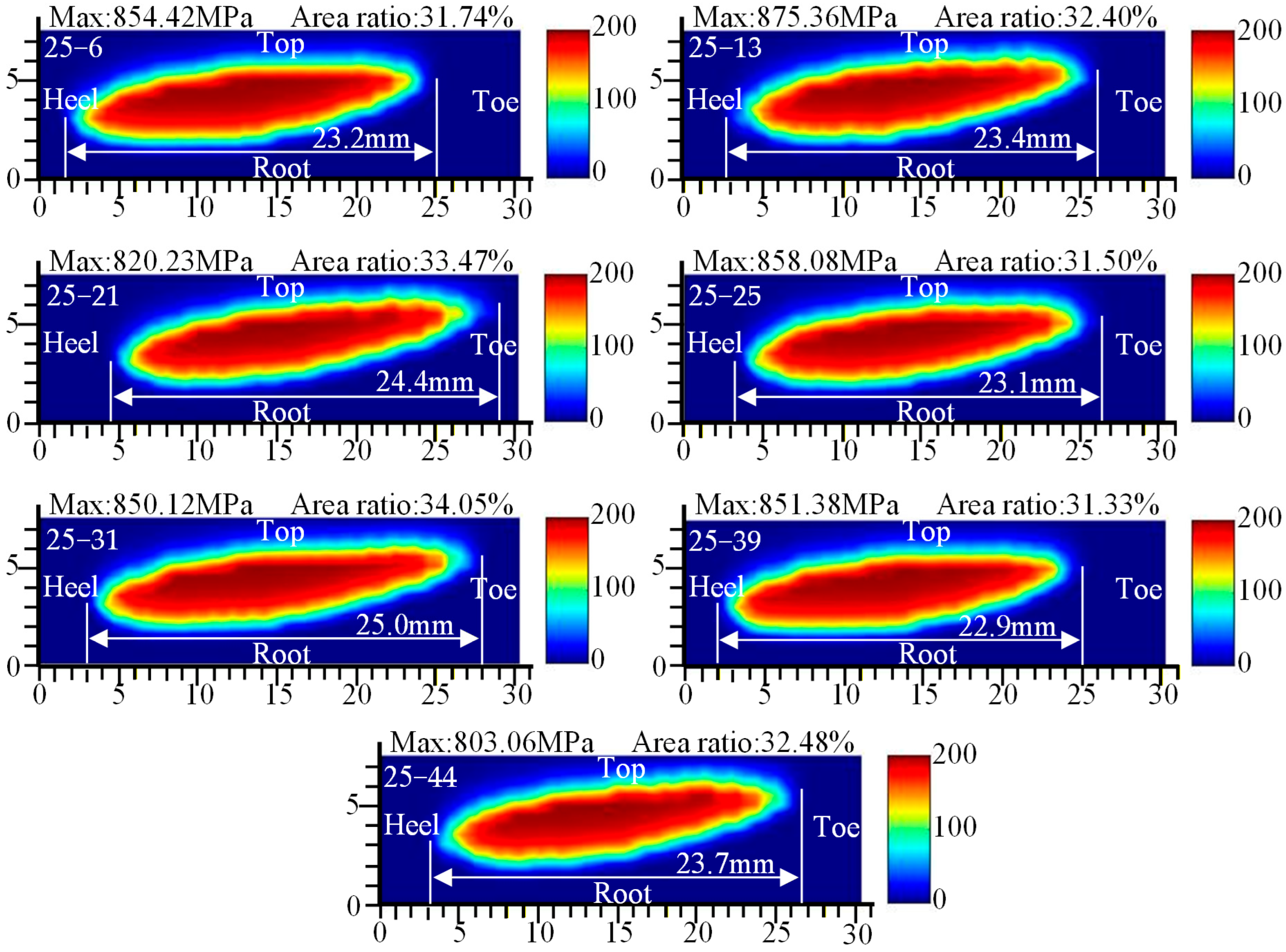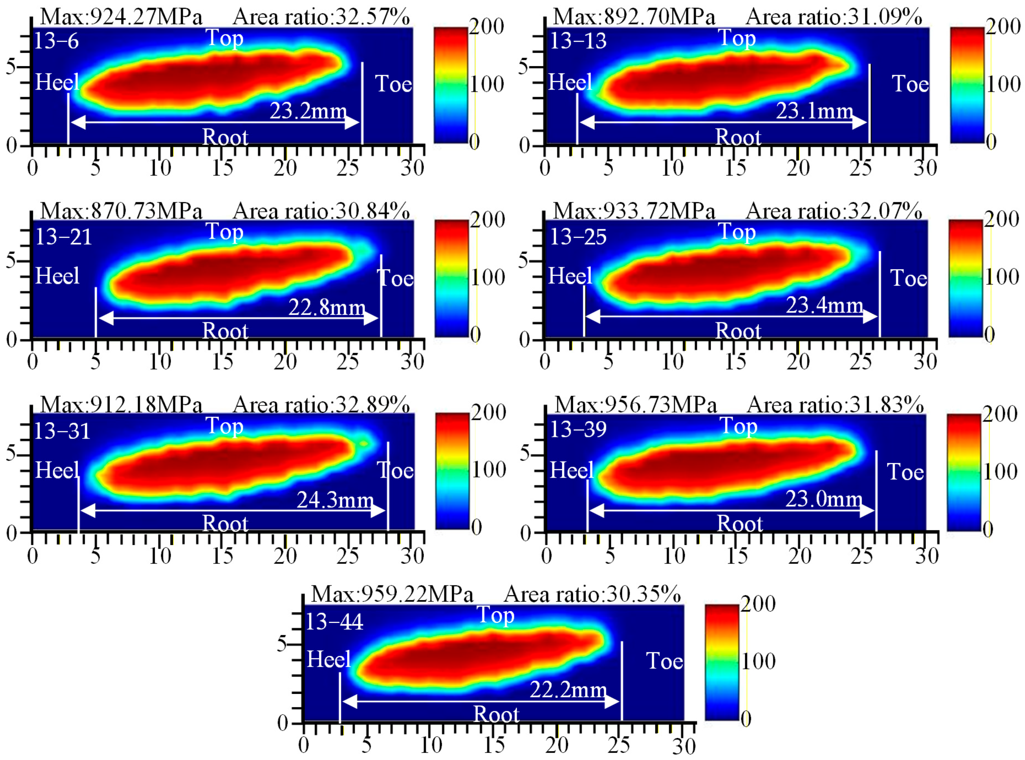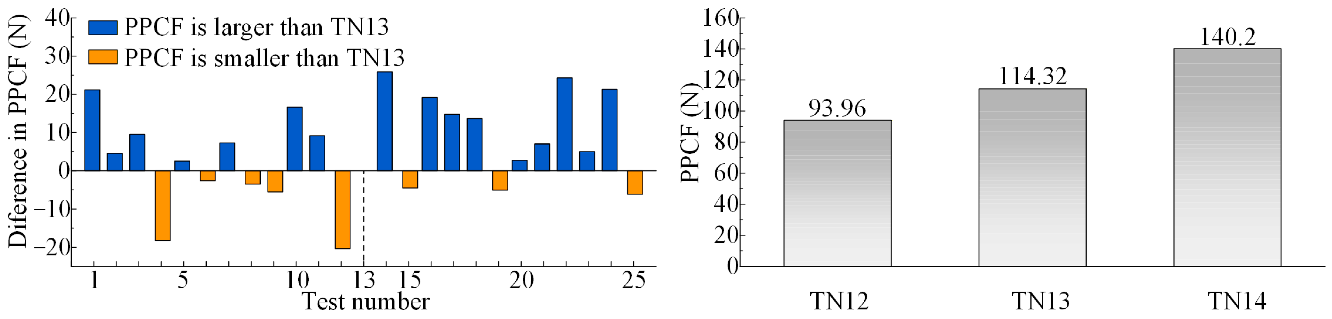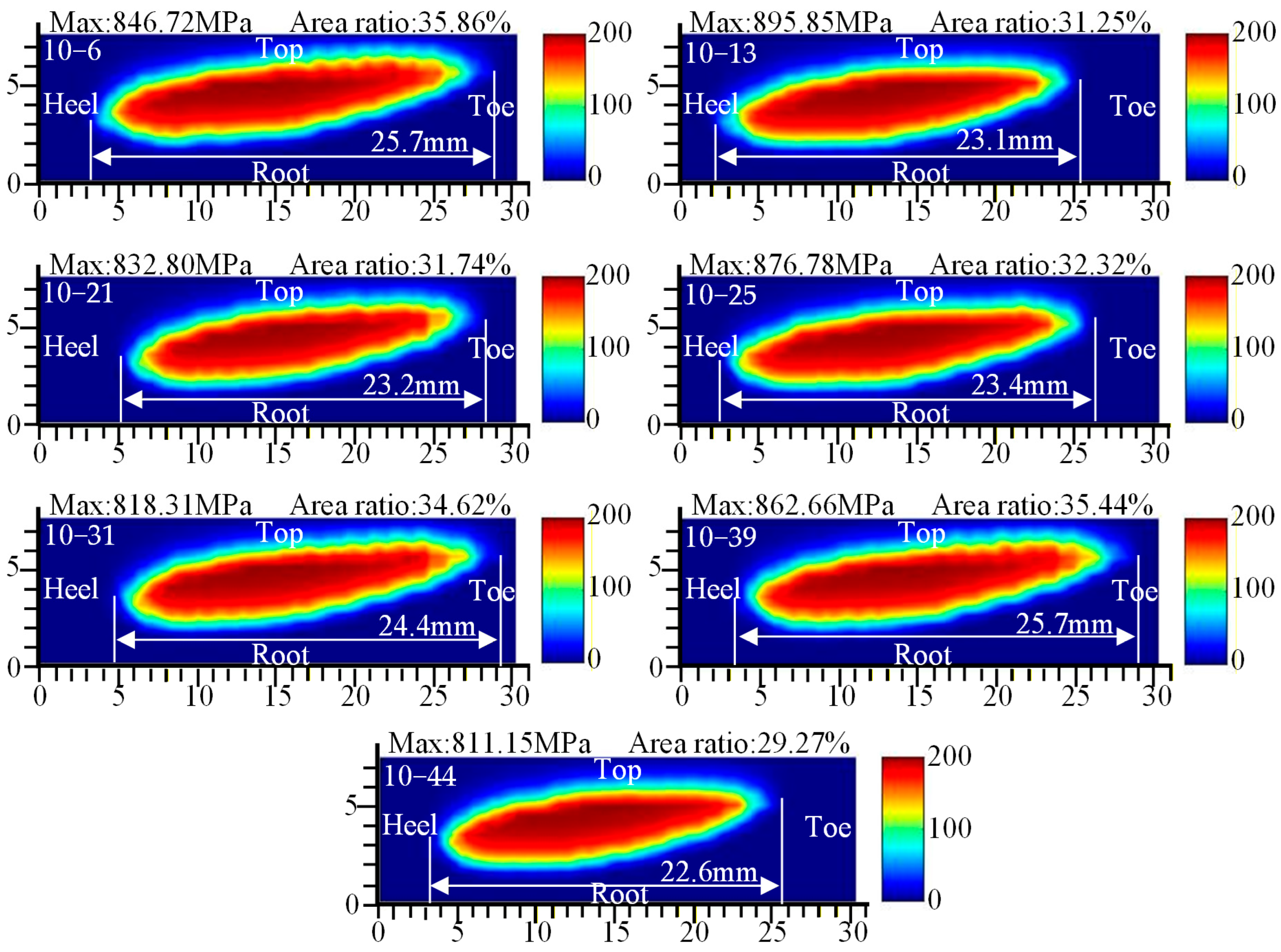 - Under TN10, the PPTE is reduced by 3.78% compared to TN13, thereby collectively enhancing meshing performance. Under TN25, the PPTE increases by 26.28% compared to TN13. However, the contact pattern average length improves by 2.29%, and the maximum contact stress is significantly reduced.