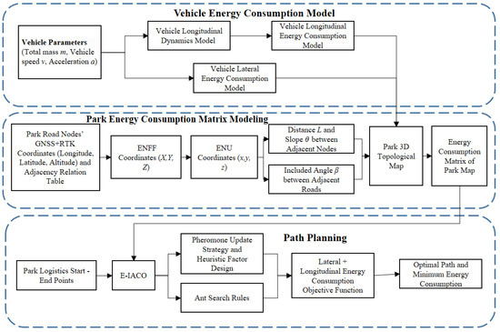 This paper presents an enhanced global path planning method based on E-IACO for energy consumption minimization, effectively addressing the critical limitation of conventional planning approaches that neglect road gradient, steering dynamics, variable payload, and regenerative braking characteristics in park logistics scenarios. The principal contributions are threefold: (1) Development of a refined vehicle energy consumption model that transcends conventional dynamic modeling by systematically integrating gradient resistance, load variations, steering losses, and regenerative braking effects, establishing a theoretical foundation for accurate energy prediction; (2) Proposal of a methodology for constructing 3D topological maps from high-precision positioning data, fused with the energy model to generate an energy consumption matrix, thereby transforming continuous high-definition road network information into a structured search space for subsequent path optimization; (3) Design of an energy-oriented E-IACO algorithm incorporating an exponential energy-based heuristic factor and simultaneous consideration of steering energy consumption, effectively guiding the search toward globally energy-optimal paths while computing corresponding energy values. Simulation results in a 3D industrial park environment demonstrate the method’s effectiveness. Compared to classical A* and standard ACO algorithms, the proposed E-IACO achieves a maximum energy reduction of 10.57% versus A* and 4.90% versus ACO, with average savings of 5.14% and 1.97%, respectively, across varied topographic conditions. The algorithm also exhibits consistent energy-saving performance under different vehicle loads, confirming its robustness and practical relevance for park logistics.