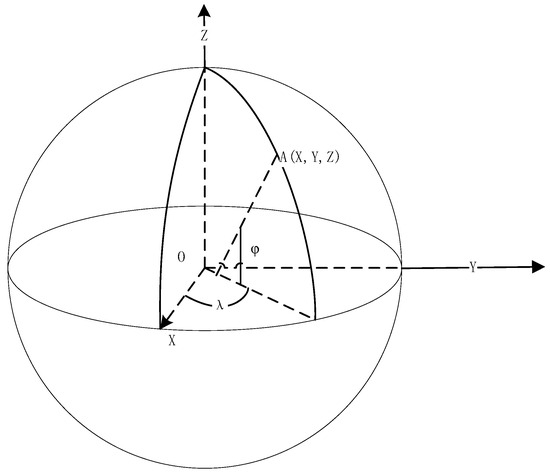 Let the coordinates of point A in the WGS-84 coordinate system be denoted as , in the ECEF coordinate system as , and in the ENU coordinate system as . The transformation from ECEF to ENU coordinates is expressed as follows [32]: