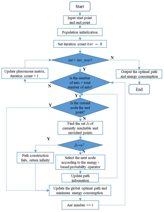 During each iteration, pheromones deposited on every edge are evaporated at rate , as given in Equation (15). At the beginning of the search a relatively large is adopted to strengthen global exploration and to keep the algorithm from being trapped prematurely in poor local optima; as the iterations proceed is gradually reduced to speed up convergence. This dynamic-evaporation scheme not only prevents unlimited pheromone accumulation but also helps eliminate the inferior paths discovered in early stages. Meanwhile, after an ant completes its tour, it deposits pheromone according to the quality of the path. The traditional ACO usually takes path length as the basis for pheromone enhancement. However, this paper aims to minimize the total energy consumption as the optimization objective. Therefore, the pheromone update strategy is adjusted as follows: the lower the total energy consumption of the path, the more pheromones are released. Through this mechanism, subsequent ants are guided to select paths with lower energy consumption with a higher probability, thereby gradually approaching the global optimal solution. The pheromone update is shown in Equation (16), Specifically: