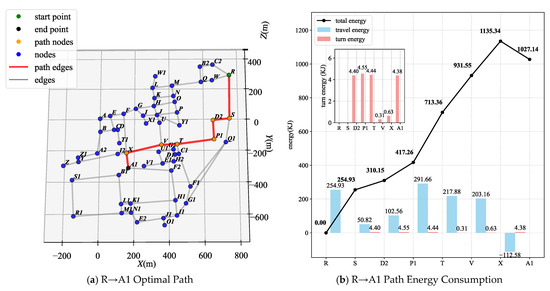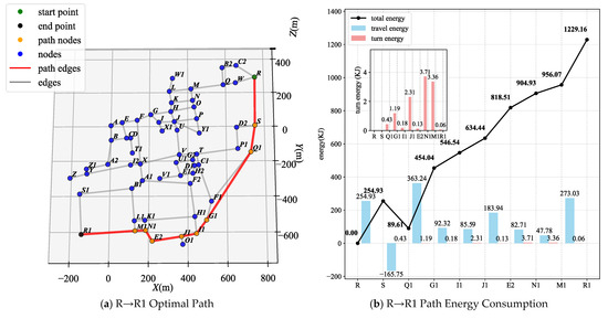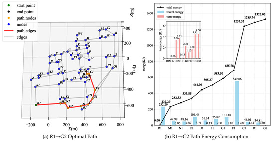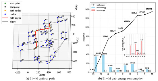Employing the E-IACO algorithm, this study solved vehicle path planning problems across different scenarios under conditions of a total vehicle mass of 5300 kg and a constant speed of 30 km/h. Optimal paths and their energy consumption characteristics were obtained for each scenario. Experimental results are presented in Figure 7, Figure 8, Figure 9 and Figure 10, which, respectively, illustrate schematic diagrams of optimized paths from various starting points to destinations, along with corresponding segmented energy consumption analysis charts. The energy consumption analysis comprises two components: turning energy consumption and driving energy consumption. The occurrence of negative driving energy consumption in Figure 7b and Figure 8b visually demonstrates the energy recovery process during vehicle descent, validating the energy consumption model constructed in this paper for capturing this physical characteristic.