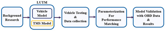 The main aim of this article was to develop a comprehensive experimental-based vehicle model using the Simulink and Simscape platforms. Thereafter, the vehicle system model was integrated with a thermal management model to form the Loughborough University Model (LUTM). Vehicle testing was performed to gather experimental test data, and the model was parameterized and performance matched with the real vehicle. The model was validated with test data and used for studying the range impact for different environmental temperatures. Figure 1 denotes the overview of the work undertaken.