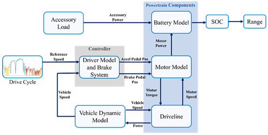 Vehicle modeling can be divided into the following two main approaches: forward-facing models and backward-facing models. The forward-facing vehicle model is depicted in Figure 2. The forward-facing vehicle model consists of a driver model that generates torque demand based on the motor, depending on the power source, to meet the speed requirements from the vehicle. The driver model incorporates a Proportional-Integral (PI) controller to generate the torque demand [10]. The torque produced by the prime mover is transferred to the transmission and the final drive ratios, and is then finally applied to the wheels. Then, it is applied to the whole vehicle mass via the tire contact patch. The battery model predicts the charge depletion due to the power consumption of the powertrain and vehicle accessories. By considering the remaining amount of energy in the battery, range estimation was performed. The forward-facing modeling approach was followed for constructing the vehicle model of the LUTM.