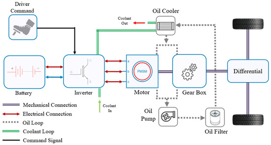 The drive unit consists of an assembly of multiple components as an integrated design. The main components can be highlighted as the inverter, motor, reduction gear box, final drive (differential), coolant loop, and lubricant system. Figure 5 denotes the system diagram of the rear-drive unit of the M3. The diagram was constructed based on the explanation of the Model 3 drive unit teardown [14]. In terms of the front-drive unit, it has the same configuration but uses an induction motor.