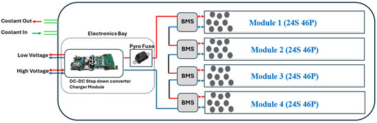 Several sub-systems have been integrated into the battery pack, such as battery cell modules, Battery Management Systems (BMSs), a DC-DC converter, a charger, a pyro fuse, and a contactor. A coolant loop was designed for the heat exchange between the battery pack and coolant loop. Based on Sandy Munro’s battery pack teardown video [21,22], the following simplified diagram was made.