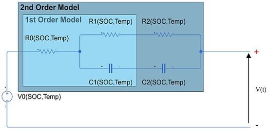R0 represents the ohmic resistance of the cell. It models the instantaneous voltage drop when the load is connected. It is associated with the internal resistance of battery materials, such as electrodes and electrolytes. N is the number of resister and capacitor pairs that can be used to capture the time-dependent voltage drop of the system. One pair is for capturing the slow transients of the system and the other pair is for the fast transients. In this model, a second-order (with two RC pairs) equivalent circuit model is shown. By increasing the number of pairs, the model accuracy can be increased [25].