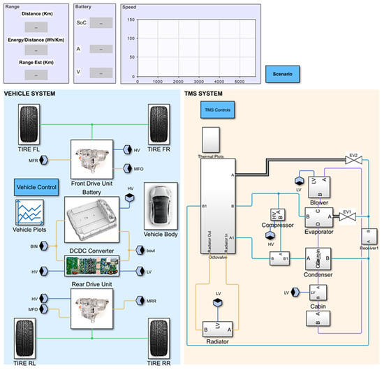 For the model construction, several existing vehicle models available in MathWorks were referred to. The Battery Electric Vehicle System model [30] and Electric Vehicle Thermal Management System model (ETMS) [31] can be highlighted as the key models. By thoroughly studying these models, the LUTM vehicle model was constructed. The main systems of the model are discussed in what follows.