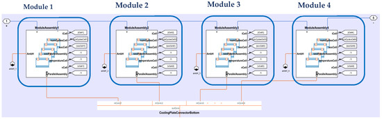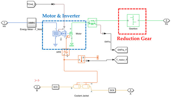 Figure 11 represents the architecture inside of the front- and rear-drive units of the model. The model was constructed to match the same architecture as the vehicle discussed in Section 2. Due to the complexity in the parameterization, the lubricant circuit with the oil pump in the real vehicle were not constructed in the model. The coolant jacket was constructed and integrated with the TMS system.