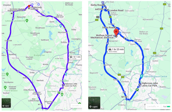The saved csv files could be accessed from an Android device. When observing the recorded data, it was found that the data stream was recorded for every millisecond interval, and, as a result, the file sizes were too large. Also, the intervals between the data points were not consistent in all of the data streams. Different data streams had different intervals between the data points. To mitigate the inconsistency and reduce the file size of the csv files, a MATLAB tool was developed. The tool filled in the missing data points through interpolation and, afterwards, the data points were selected for a time step of one second and averaged. Therefore, the dataset was reorganized for the one-second time interval, thus rendering it consistent with all of the data streams. The file size was also reduced. A MATLAB Graphical User Interface (GUI) was developed for the data processing. With the GUI, the csv files can be directly selected from the location and processed easily (Figure A1, Appendix A). Table 2 denotes the summary of the tests that were conducted.