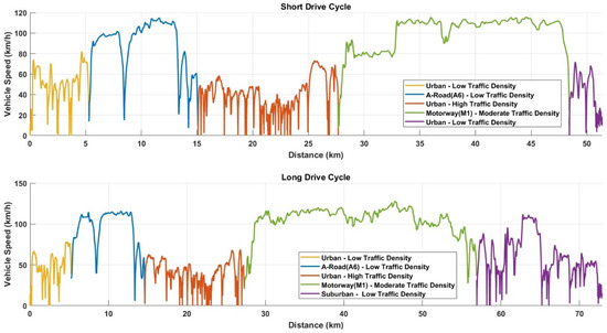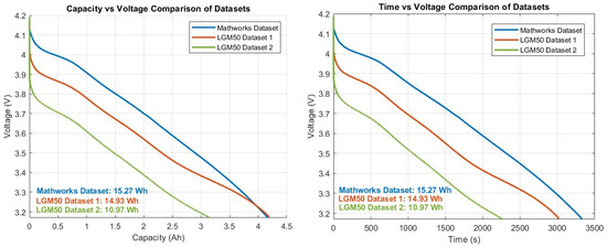Modeling EVs involves the simulation of interactions between complex components such as battery packs, motors, power electronics (converters and inverters), and control systems. Vehicle models enable engineers to predict and optimize the vehicle energy consumption, range, and overall performance [4]. Detailed and accurate modeling techniques are vital for the industry [5,6]. The Tesla M3 Standard Range vehicle’s 50 kWh battery pack with the Panasonic NCA cylindrical cell was used, and the test data for the NCA cells were published [6].