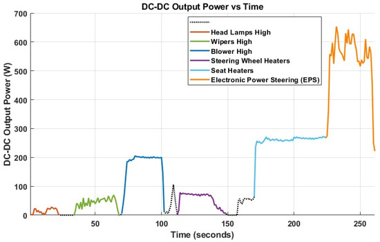 Figure 9 denotes the circuit used for modeling the DC-DC converter. It is essential to keep the voltage constant on the load side. In the vehicle, it should be 15.6 V. represents the converter loss at zero output power. represents the electrical losses that increase with an increasing load current. is defined based on the parameter percentage efficiency t rated output power [28].