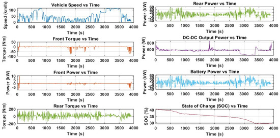 The instantaneous battery output current and voltage were measured from the battery block so that the power consumption could be calculated. By mathematically integrating the power consumption, the energy consumption was calculated. By mathematically integrating the vehicle speed over time, the distance traveled could be estimated. Therefore, the energy consumption per km could be calculated in Wh/km. By multiplying the total capacity of the battery by the SOC, the remaining capacity at a particular instance could be estimated. If the remaining pack energy was divided by the energy consumption in Wh/km, the remaining range at every instance could be calculated. This method was used for the range estimation. For matching with the real vehicle, we considered the depth of the discharge, aging, and higher energy densities of the existing cell models, as well as all of the other factors. A multiplication factor was used. From the model battery’s total capacity, only 75% was considered as a usable amount, because the battery cell parameters being used are an approximation, with a higher energy density per unit cell.