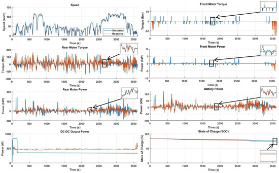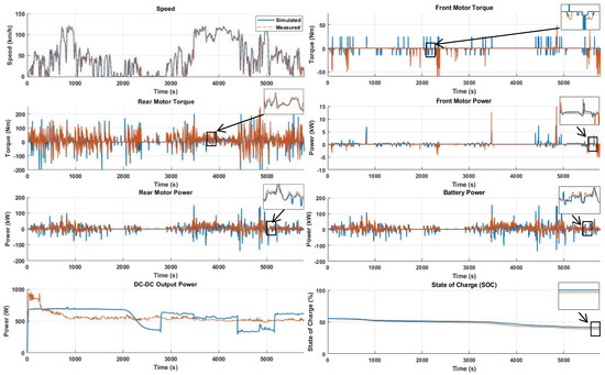 For the construction of the vehicle model, the real vehicle architecture was studied, and the same architecture was constructed (low-voltage battery and LV accessories were not modeled). The vehicle driveline model was constructed by carefully considering the overall vehicle specification. The remaining components of the vehicle model can be highlighted as the front- and rear-drive units, high-voltage battery, DC-DC converter, and vehicle controls. Measuring blocks were also constructed, such as energy consumption meters and a range estimator.