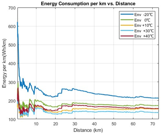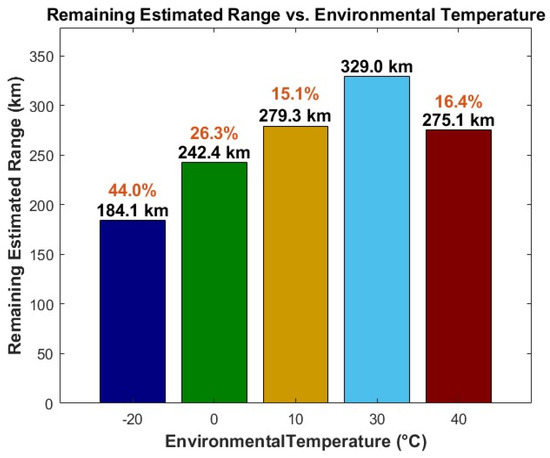 The baseline was considered as +30 °C, where the 329 km range was available at the end of the cycle. When decreasing the temperature to −20 °C, the range was decreased to 184.1 km, where the percentage decrease in the range was 44%. When considering higher temperatures, such as +40 °C, a 16.4% range decrease was observed.