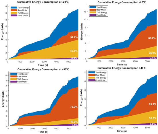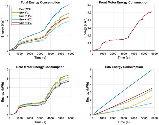 Figure 23 denotes the total and system-wise energy consumptions. The total energy consumption showed significant changes due to the different environmental temperatures. The main contributors can be identified as the rear motor and the TMS system. As an example, at −20 °C, the TMS demands a high amount of energy to provide heating for the passenger cabin and the battery. The front motor can be seen as being idle in most of the scenarios, where it has a minimal impact to the total energy consumption. The +30 °C condition had the lowest total energy consumption. The rear motors showed the lowest energy consumption at +40 °C, but, due to the high consumption of the TMS at this temperature, the total energy consumption was high. This cross-verifies that the most efficient range of operation for the vehicle is close to +25 °C to +30 °C. Similar trends were observed with [39] based on a Nissan Leaf.