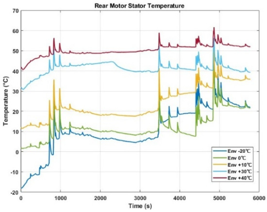 The rear motor energy consumption needs to be investigated along with the motor temperature (Figure 24). It can be observed that, at −20 °C and 0 °C, with the TMS integration, the motor temperatures are well maintained in the same region. Therefore, as depicted in Figure 24, very close energy consumptions can be observed. This validates the motor model’s thermal dependency, but the energy consumption is higher in cold conditions when compared to the baseline temperature. In the real vehicle, these losses will be mainly due to the increased viscosity of the lubricants, the higher bearing losses due to friction, changes in the magnetic flux of the permanent magnets, and the expansion and contraction of materials.