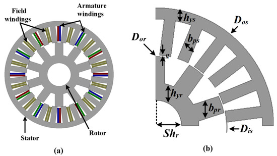 Figure 1a. This arrangement ensures effective torque production and highlights the advantages of eliminating permanent magnets, which are replaced by DC-fed field excitation coils (FECs). The stator, which contains the armature windings and the FECs, plays a dual role in generating AC voltage and establishing the magnetic flux required for torque production.