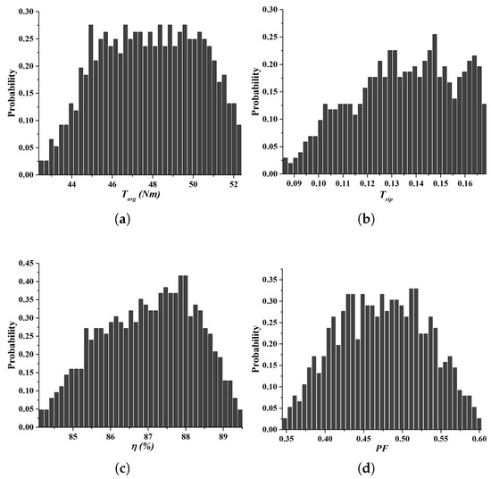 Figure 8d presents the power factor (PF), which achieves a more uniform and higher distribution, ensuring improved electrical performance. These results confirm that incorporating uncertainties within the robust optimization model leads to a highly reliable and consistent machine performance under real-world conditions.