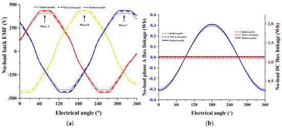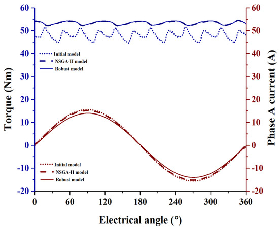 Figure 10 presents the torque and current waveforms. The robust model demonstrates smoother torque delivery with significantly reduced ripple, while the phase current waveform shows improved sinusoidal characteristics, ensuring reduced energy loss and operational stability. The results demonstrate that the proposed robust optimization framework effectively integrates RSM, sensitivity analysis, and DFSS methodology to optimize machine performance while managing uncertainties. The robust model achieves higher