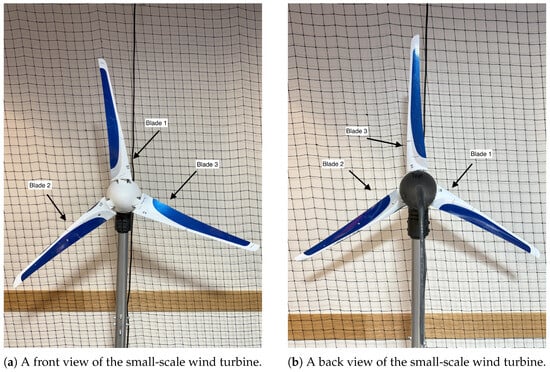 Figure 1. The small-scale wind turbine with intentionally created blade defects. The turbine has three carbon fiber blades (labeled as 1, 2, and 3 clockwise from the top) with the following dimensions: rotor diameter = 1.17 m ; blade length = 0.585 m ; and swept area = 1.07 m 2 .