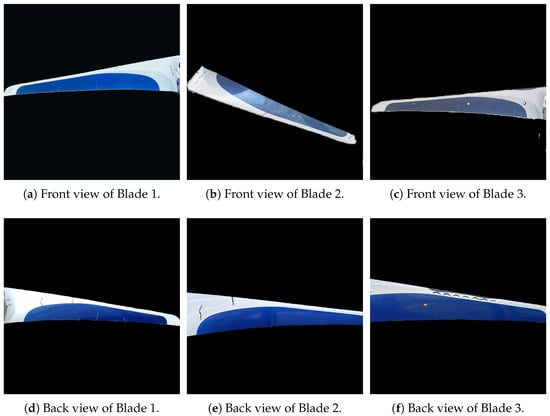 Figure 2a–c display different perspectives of the front blades. These images are particularly valuable for examining the blade profiles and their surface condition, highlighting the artificially created defects for detailed assessment. Similarly, Figure 2d–f show the back sides of the blades. These images help in assessing the wear and the specific artificially induced damage that could affect the performance of the turbine over time.