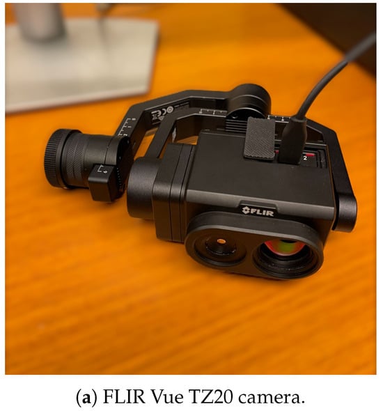 This research utilized the FLIR Vue TZ20 camera, shown in Figure 3 specifically engineered for drone operations. The camera features a spectral range of 7.5–13.5 μ m and thermal sensitivity (NETD) < 50 mK at f/1.0. It features a dual thermal camera system with a 20× digital thermal zoom, allowing for both wide and focused field-of-view options. This versatility is crucial for capturing detailed thermal data across various inspection scenarios, from public safety to industrial inspection. The camera operated in conjunction with FLIR Boson GUI 3.0 on a Windows platform, designed to enhance the development and deployment of thermal imaging solutions. The suite offers a user-friendly interface for the efficient management and processing of thermal images. The camera was connected to the drone using the gimbal depicted in Figure 3b, which ensured stable mounting and precise control during flight. The interface and connection setup are illustrated in Figure 3c. For further technical details, the FLIR website provides extensive information on the Vue TZ20-R’s specifications and integration capabilities with DJI Matrice M200 v2- and M300-series drones via the Skyport V2.0 gimbal. The deployment of this camera in our project focused on capturing high-quality thermal images that revealed minute defects in the WTBs, a task compounded by the complexities of outdoor environmental conditions.