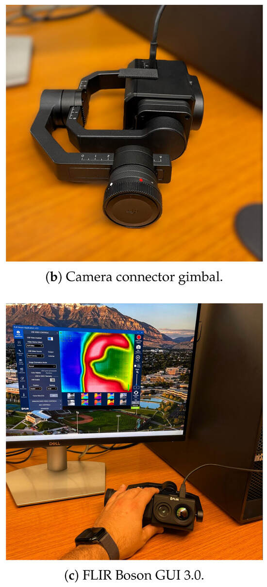 Figure 3. (a) FLIR Vue TZ20 camera, (b) camera connector gimbal, and (c) camera connected to FLIR Boson GUI 3.0 application.