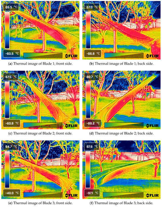 Figure 4. Thermal images of the small-scale wind turbine blades, showing the front and back views of each blade. The images were processed in FLIR Thermal Studio using Digital Detail Enhancement, enabling clearer visualization of the defects and making them more discernible for human interpretation.