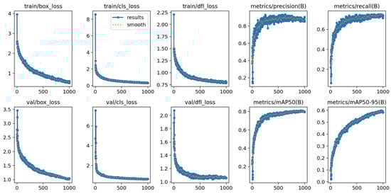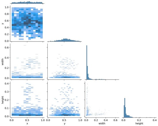 Figure 12. This figure illustrates the relationships between different bounding box attributes (x, y, width, height) used in the YOLOv8 model. The x- and y-axes represent these attributes. The color intensity indicates the density of occurrences, with darker colors representing higher densities. This visualization helps in understanding the distribution and correlation of bounding box attributes, which is important for improving the model’s detection and localization capabilities.