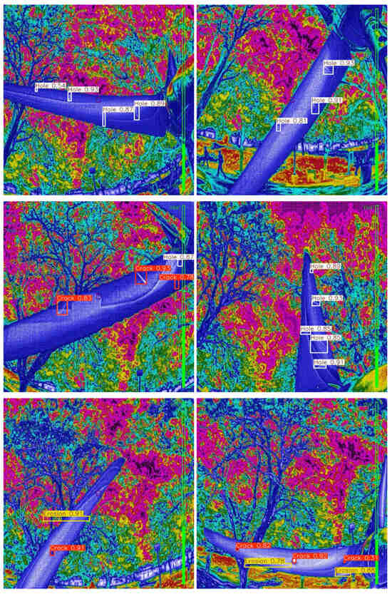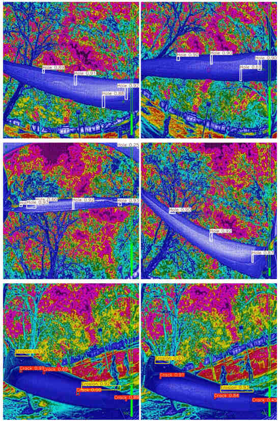 Figure 14. Examples of defect detection using YOLOv8 on thermal images of wind turbine blades (WTBs). The first row corresponds to Blade 1, the second row to Blade 2, and the third row to Blade 3. Detected defects include holes, erosion, and cracks, demonstrating accurate localization and classification.