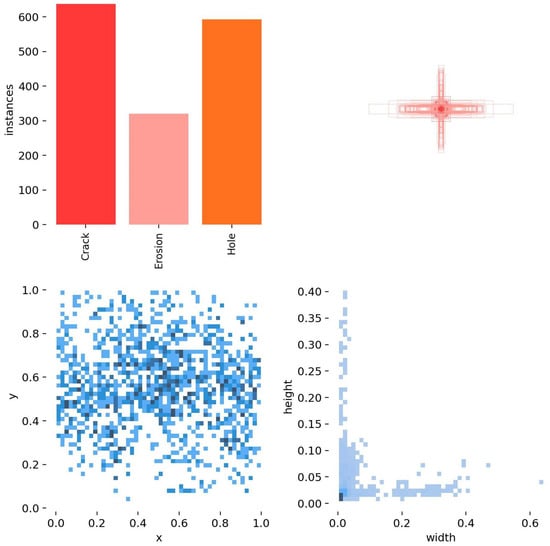 Figure 13. This figure showcases the label distribution and bounding box dimensions for YOLOv8. The (top left) bar chart shows the frequency of different defect types (cracks, erosion, holes) on the x-axis and their instances on the y-axis. The (bottom left) scatter plot shows the spatial distribution of defects with x- and y-coordinates representing the position on the WTB surface. The (bottom right) scatter plot shows the relationship between bounding box width and height with the width on the x-axis and height on the y-axis. The (top right) visualization depicts the anchor boxes, which are preset dimensions used during model training to identify objects of varying shapes and sizes. This visualization emphasizes the model’s capacity to adjust to diverse defect dimensions, which is critical for accurate localization and classification in practical applications.