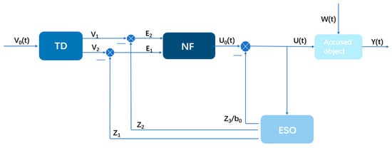 where represents the unknown model disturbances and external disturbances. The structure of the ADRC controller is shown in Figure 3, consisting mainly of three parts: (1) the Tracking Differentiator (TD), which arranges the transition process and provides the differential signals of the process; (2) the Extended State Observer (ESO), which observes the internal states of the system; and (3) the Nonlinear Feedback (NF) control scheme, which compensates for system errors [20,37].