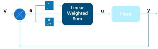 Figure 4 shows the structure of the PID controller, consisting of the PID controller and the controlled object. In the control system PID controller involves three independent parameters [40]—proportional value (P), integral value (I) and derivative value (D)—describing P, I and D in terms of time, i.e., P depends on the current error, I depends on the accumulation of the past error, and D is a prediction of the future error based on the current rate of change. The mathematical description of the algorithm is: