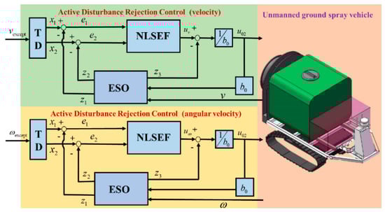 For tracked sprayers used in orchard pest control, the vehicle mass decreases as the spray liquid is consumed, and multi-source unknown disturbances, such as liquid sloshing in the tank, nonlinear friction, air resistance, and unmodeled system components, can affect the tracked unmanned vehicle. To address this issue, Wang et al. [58] designed a tracked orchard sprayer robot employing ADRC to enhance system noise resistance, as shown in Figure 5. This robot uses two active disturbance rejection controllers to receive the desired speed and angular velocity, outputting corresponding control signals to enhance its noise resistance. Subsequent field trials further validated the feasibility of the developed system, achieving a canopy leaf coverage rate of approximately 50% and significantly improving the robot’s control accuracy.