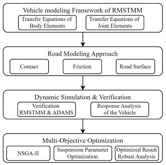 Logical framework of the study. The framework begins with the vehicle-modeling approach based on RMSTMM, including transfer equations for body and joint elements. This is followed by road modeling, encompassing contact, friction, and road surface characteristics. Dynamic simulation and verification steps compare RMSTMM and ADAMS results, assessing the response of the vehicle to various conditions. Finally, multi-objective optimization using NSGA-II is employed to optimize suspension parameters, with robust analysis of the optimized results.