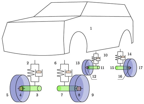 Schematic representation of the entire vehicle model, highlighting key components and their interactions. The model includes the vehicle body (1), suspension systems (2, 6, 10, 14), unsprung masses (3, 7, 11, 15), connections of wheel and axle (4, 8, 12, 16), and wheels (5, 9, 13, 17).