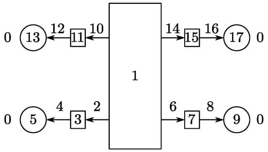 The dynamic model topology diagram is established based on the vehicle multibody system dynamics model, as is shown in Figure 4. The graphic ◯ and □ represents the body element, and the number is the label of the body element; The arrow ⟶ indicates the joint element, the number next to it indicates the number of the joint element, and the arrow points to the transfer direction of the system state vector. The ground is marked as a rigid body 0. The four wheels 5, 9, 13, 17 and four unsprung masses 3, 7, 11, 15 are single-tip, single-root spatial motion rigid bodies, while the vehicle body 1 is a multi-tip, single-root spatial motion rigid body. The interaction between the wheel and axle is equivalent to a revolute joint 4, 8, 12, 16, and the interaction between the unsprung mass and vehicle body is equivalent to a translational joint 2, 6, 10, 14. The generalized coordinates of the system are composed of the generalized coordinates of all joint elements in the system.