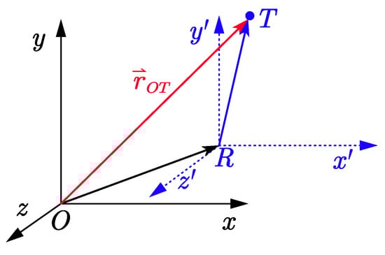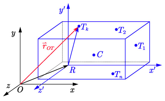 where R and represent the root marker and the k-th tip marker of the rigid body, respectively. The vector defines the displacement from the root marker R to the k-th tip marker , expressed in the body-fixed coordinate system of R. The notation denotes the skew-symmetric operator used to compute the cross-product for vector •. Skew-symmetric matrices can be used to represent rotational generators in three-dimensional space and are closely related to angular velocity or rigid body motion. In three-dimensional space, skew-symmetric matrices are often used to describe the cross-product operation of a vector. For vector , you can define a corresponding skew-symmetric matrix :